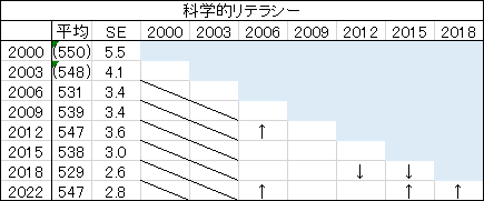 科学的リテラシーが主要分野となったのは2006年のため、それ以前との比較はできない。ただし、PISA2000とPISA2003、PISA2003とPISA2006の(暫定的)Link Errorは報告されているため検定が可能である。それぞれ以下の通りである。いずれも有意な変動は確認できなかったため、表中では空欄としている。PISA2000とPISA2006のLink Errorは報告されていない。