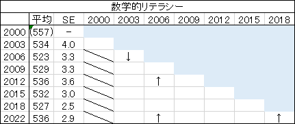 数学的リテラシーでは 「変化と関係」「空間と形」「量」「不確実性」の四つの領域が調査されているが、PISA2000では前二者しか調査対象となっていないため、その後の調査と直接比較することはできない。ただし、「変化と関係」「空間と形」についてはPISA2000とPISA2003のLink Errorも報告されているため検定が可能である。どちらの領域でも有意な変動は確認できなかったため、表中では空欄としている。PISA2006以降はPISA2000とのLink Errorは報告されていない。
